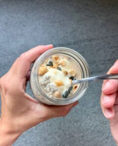 - In jar or container, combine the oats and chia seeds. Pour in enough milk to fully cover the mixture. Mix well.