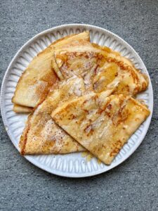 3. Stack the crepes on a serving plate. Drizzle with honey, sprinkle with powdered sugar, and garnish with chia seeds.