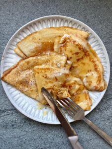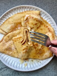 2. Heat a non stick pan over medium heat and lightly grease with butter. Pour 1/4 cup of batter into the pan, swirling to spread it evenly. Cook each crepe for 30 seconds on each side, or until lightly golden.