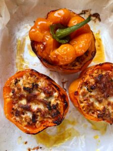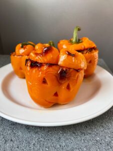 Place them in a baking dish, drizzle with olive oil, and bake until the peppers are tender and slightly browned on top.