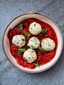 Spread the tomato sauce on a plate, add the ricotta balls and roasted tomatoes, then finish with a drizzle of olive oil and fresh basil.