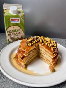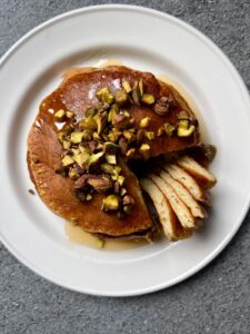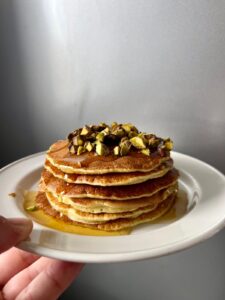 4. ⁠Stack the pancakes on top of each other, drizzle a bit of honey and pistachios.